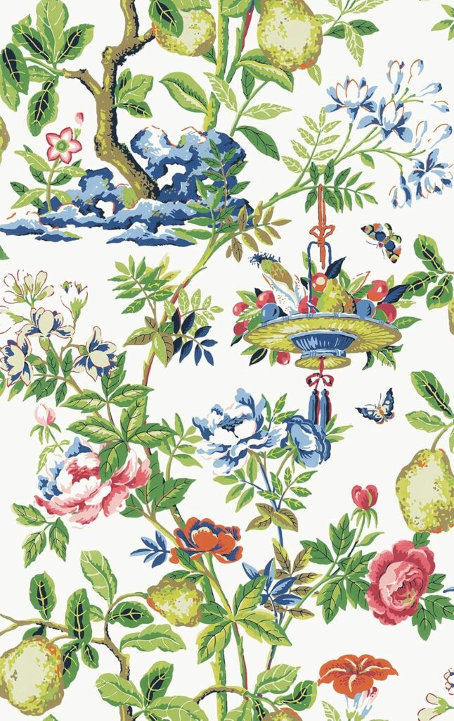 This vintage chinoiserie wallpaper with fruit baskets and vivid florals is cottage style with a touch of elegance. The lush blooms and fruit give it such a charming, vintage feel.