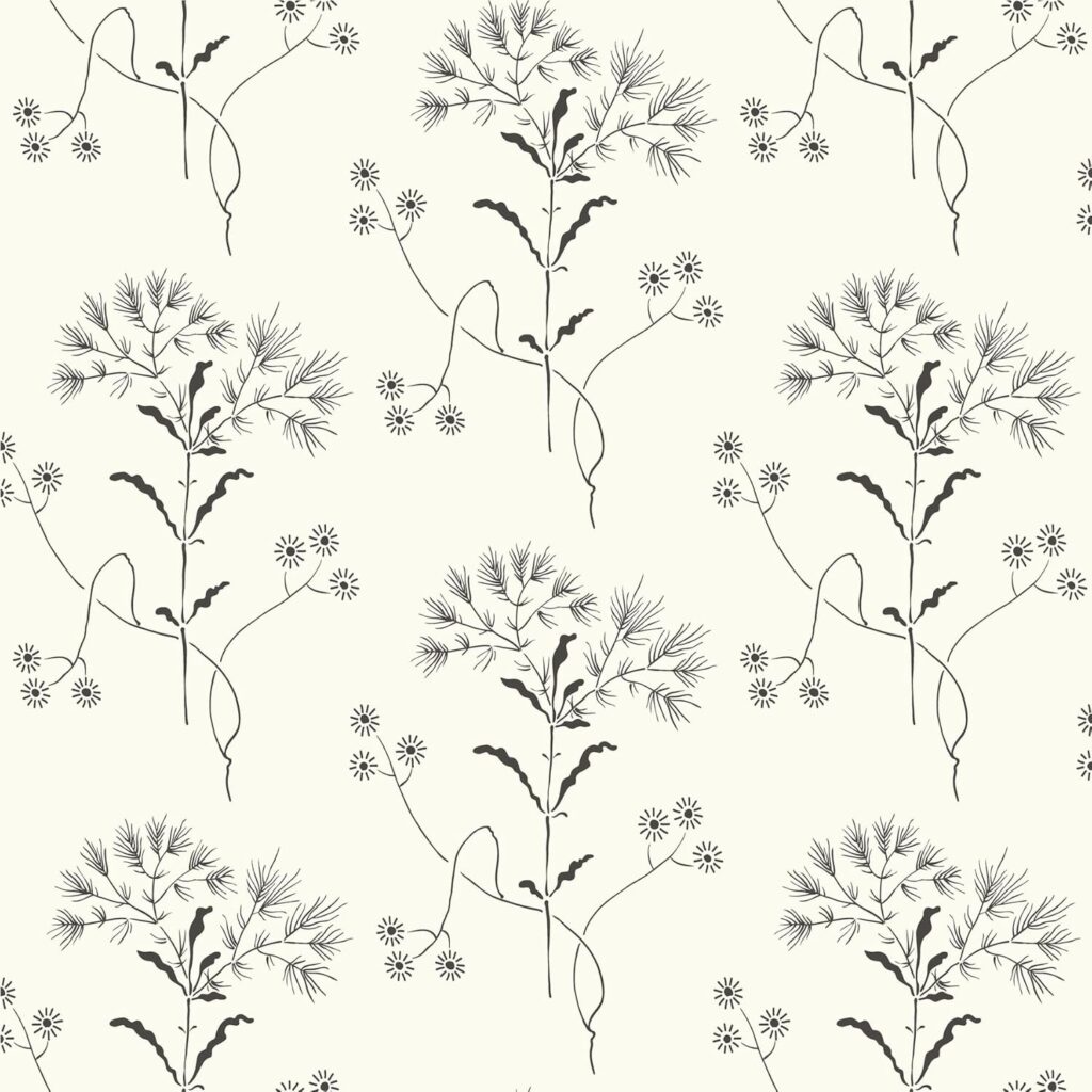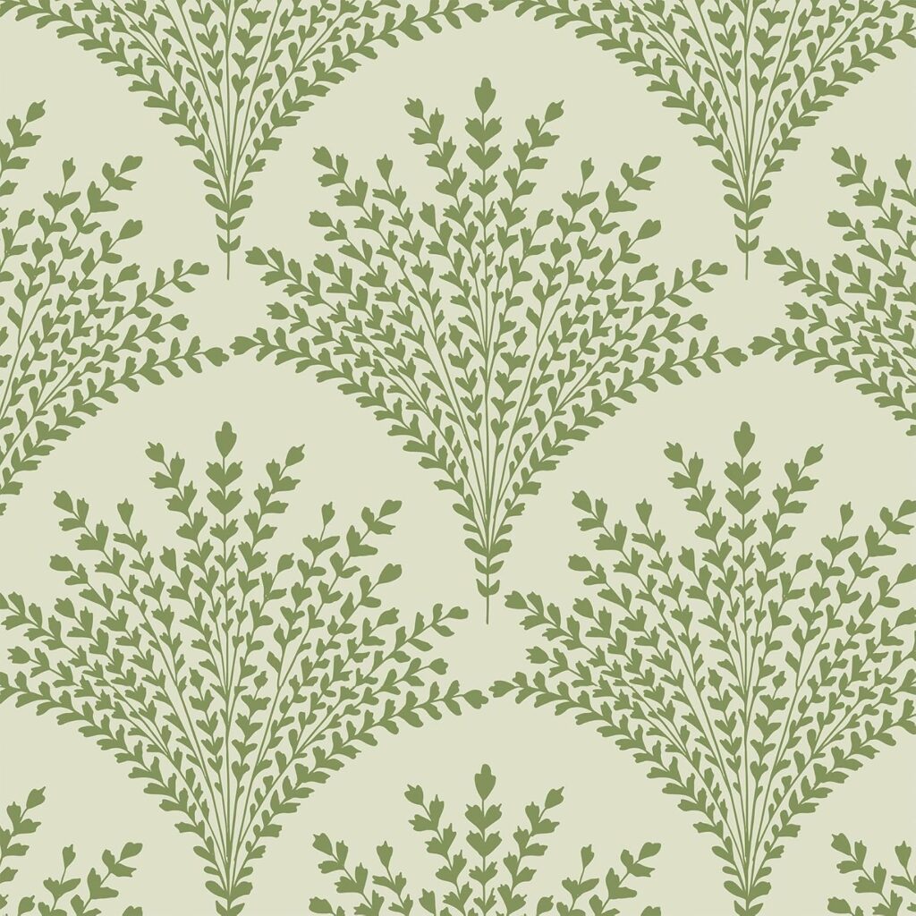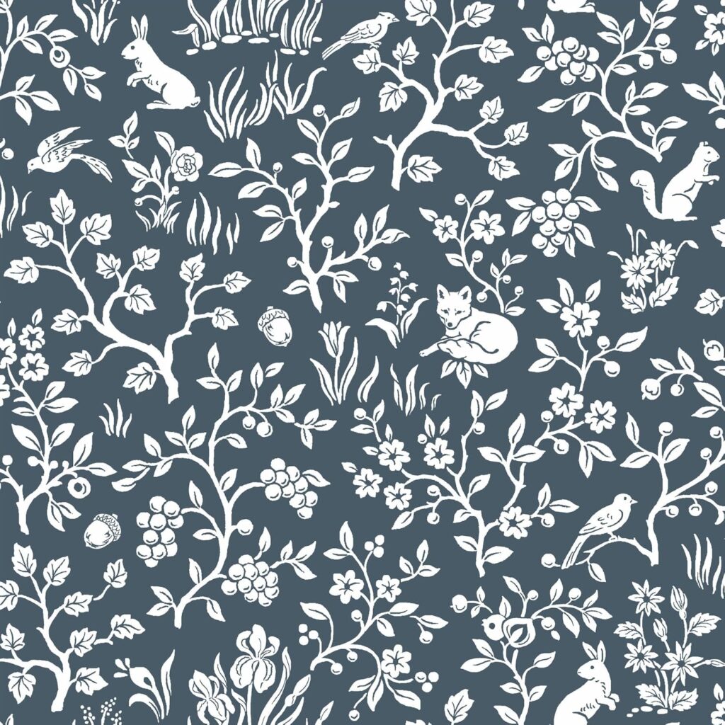 Where to use it: This pattern shines in a powder room where guests can really appreciate the details up close, or as an accent wall in a bedroom to create a serene, nature-inspired retreat. It’s also gorgeous in a home office or reading nook where you want visual interest that won’t compete with your books and decor. The black and white palette means you can pair it with literally any cottage color scheme—soft blues, warm creams, vintage pinks, or sage greens all work beautifully against this neutral backdrop.