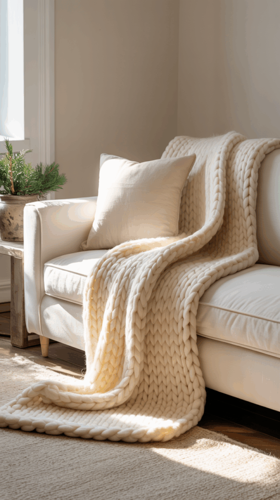 Swap Your Throw Blankets: Change your everyday throws to cream, white, or gray options. Use cozy materials like chunky knit or faux fur.
