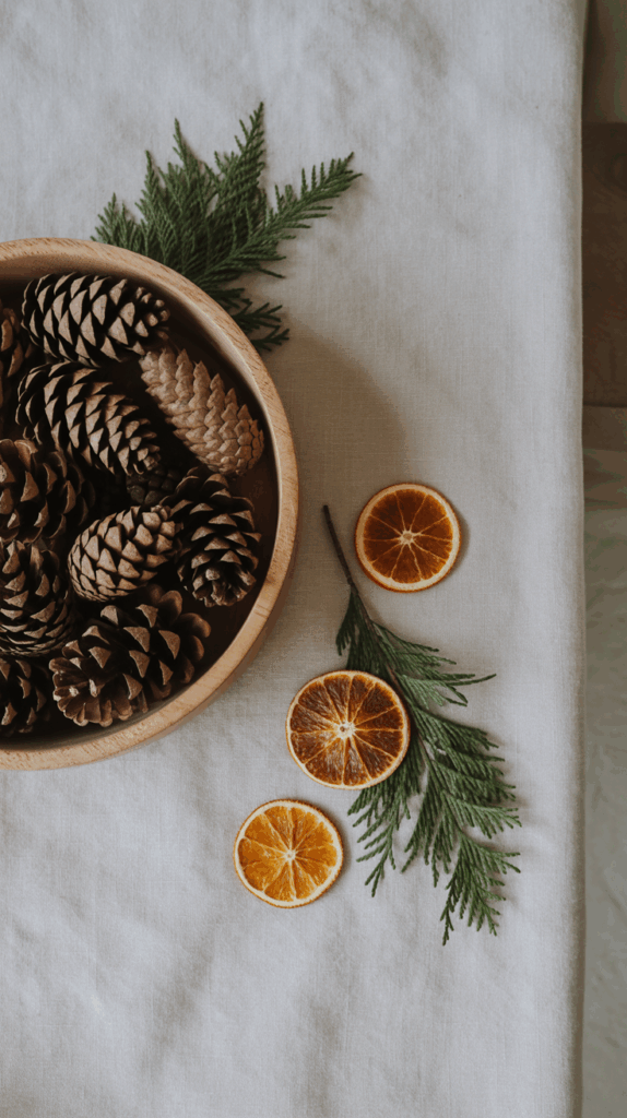 Pinecones: Gather pinecones on a walk and display them in a wooden bowl or scatter them along a table runner. You can leave them natural or lightly dust them with white paint for a frosted effect.